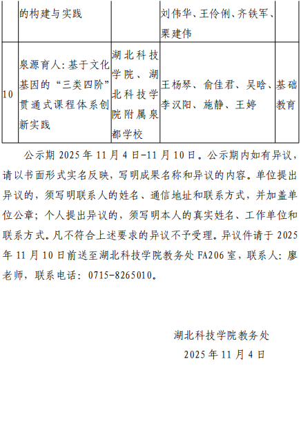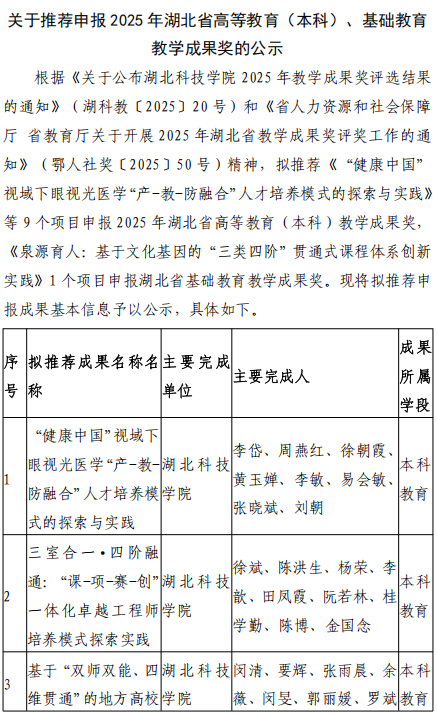 关于推荐申报2025年湖北省本科教学成果奖的公示